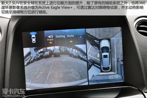 新款大7 SUV在安全輔助系統上進行功能方面的提升,除了維持Night Vision+夜視輔助系統、Side View+車側安全影像輔助系統之外,也將原本360度環景影像系統升級為Active Eagle View+,可透過雷達對障礙物偵測,并主動將影響切換至障礙物方位進行輔助。