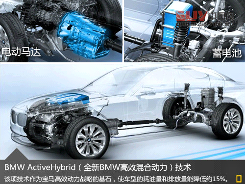 BMW ActiveHybrid(全新BMW高效混合動力)作為寶馬旗下新型的混合動力系統,通過不同的需求將傳統汽油發動機與電動機結合起來,而目前寶馬共有兩種混動系統,一種是3系、5系和7系所采用的3.0T汽油機和一臺40kw電動機,另一種則是X6所采用的4.4T引擎和兩臺同步電機(功率分別為67kw和63kw)。同時寶馬的高效混合動力技術也成為了BMW EfficientDynamics高效動力戰略的重要基石,并加上輕量化設計及優化的空氣動力學套件,使耗油量和排放量能降低約15%。