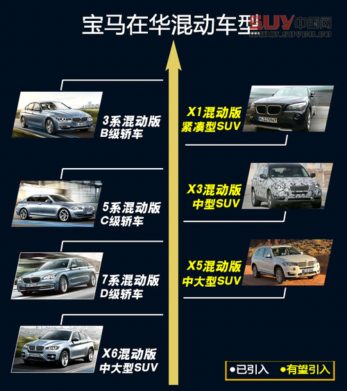 目前寶馬的混合動力產品已在華引入了3系、5系、7系以及X6四款車型,其中3款混動版轎車已覆蓋B級到D級轎車市場,而隨著未來X1、X3和X5三款混動SUV車型的引進,并加上已在國內上市的中大型跨界SUV混動版X6,將使寶馬在華混動車型的產品陣容較奔馳、奧迪等豪華品牌更為全面。