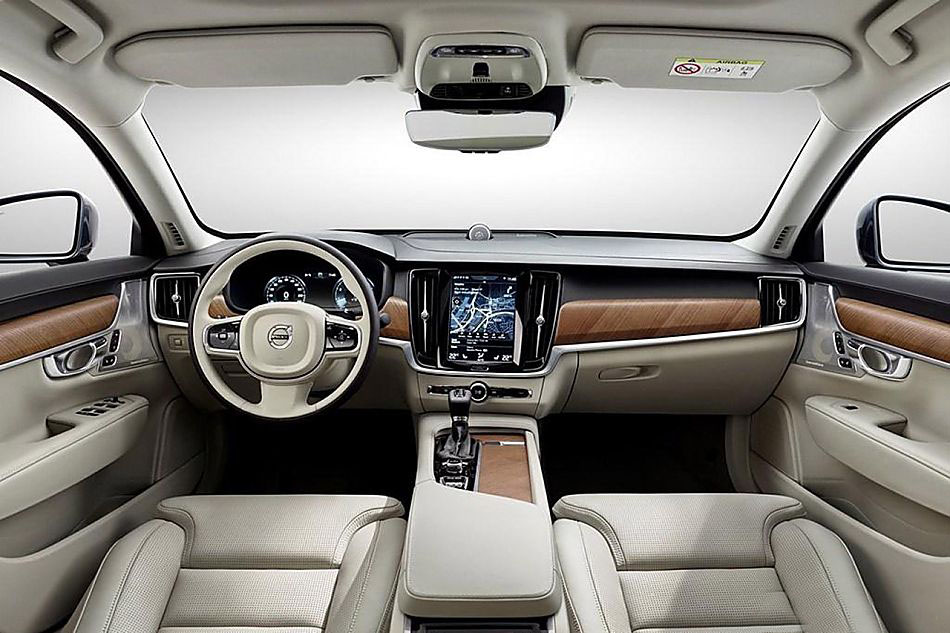 內飾的設計上與沃爾沃XC90有較多的相似之處,中控采用了大尺寸的液晶屏,并且向駕駛員一側傾斜,這塊屏幕也集成了原本應該出現在中控臺上的大多數按鍵。中控的設計非常簡約,大量采用了木紋裝飾面板和金屬裝飾件,凸顯高級感。多功能方向盤的設計也與XC90相似,功能強大,采用了雙色搭配。全新S90搭載了功能強大的Sensus智能車載交互系統。