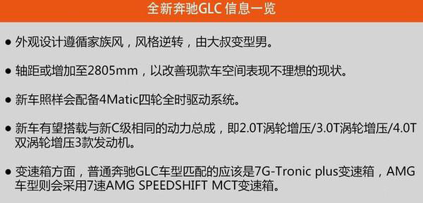 據(jù)海外媒體最新消息,全新奔馳GLC將在6月中旬正式發(fā)布。GLC作為GLK的繼任車型,有望在2016年由北京奔馳引進國產(chǎn)。此外,基于GLC打造的跨界車型——GLC Coupe概念車也已確定將在2016年推出量產(chǎn)版。