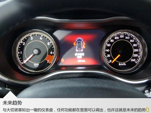 人機交互系統顯然是Jeep不能失去的功能,名為Uconnect的人機系統完全采用了液晶屏幕觸摸操作,所以導致了中控臺大面積的按鍵都集成里面,不過這也是為了的趨勢。同樣還能展現科技性的便是儀表盤的設計,除了常規的轉速和時速外,任何功能都能夠出現在中間的液晶屏幕上。