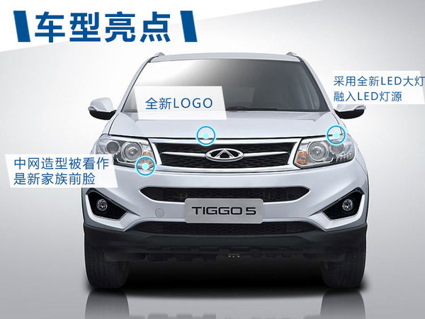 外觀方面,瑞虎5采用了全新的設計風格,整車多處采用鍍鉻裝飾,車前臉更加圓潤動感,更大的進氣格柵被全新LOGO貫穿其中十分醒目。中網造型和艾瑞澤7 十分相像,被看作是奇瑞的新家族臉譜。下格柵采用了雙排進氣口的設計,盡顯瑞虎5的越野風格。在車身尾部方面,新車采用LED燈管的設計,拉長的尾燈搭配 底下不規則的雙排氣筒使得整車有些粗獷的味道。此外,瑞虎5舍棄了外掛式備胎的設計,整體風格向城市SUV演進。