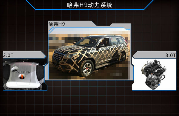 動力方面,哈弗H9將會有兩款動力總成可供消費者選擇,其中包括一款與哈弗H8同樣的2.0T渦輪增壓引擎,其內部代號為GW4C20,最大輸出功率為160kw,峰值扭矩為324Nm;3.0T V6雙渦輪增壓發動機最大功率為245kw、最大扭矩為480Nm。