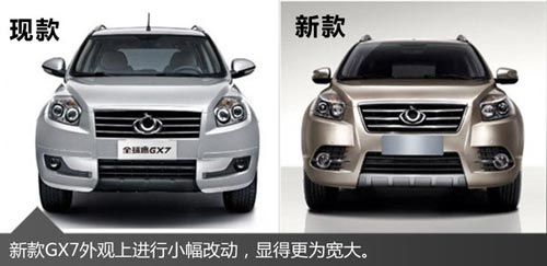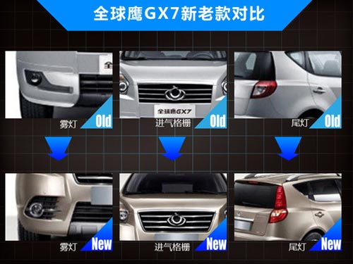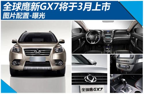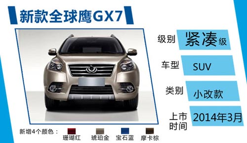 2013年,吉利全年總銷量為54.9萬輛,同比增長14%。其中被寄予厚望的全球鷹GX7全年銷量突破6萬輛,同比增長52%,成為繼帝豪EC7后吉利又一款熱銷車型。吉利汽車高層日前向媒體透露了2014年新車規劃,今年投放市場的新車型主要集中在全球鷹和帝豪這兩個子品牌,其中就包括全球鷹GX7的改款車型。近日,記者獲得了全新全球鷹GX7的一組圖片,從圖片上看新款GX7與現款相比外觀和內飾上進行了小幅改動,配置上有所提升。新車預計將于今年3月正式推出。