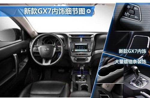 內飾方面,新款GX7增加試下流行的鍍鉻元素,中控臺、方向盤、甚至儲物格隨處可見鍍鉻條裝飾,擺脫了現款沉悶的氣息,更顯高端氣質。同時,內飾還增加個多個儲物小格,設計更加人性化。配置方面,除2.4L+6AT車型,新款GX7 2.0L+6AT車型也增加了定速巡航系統。