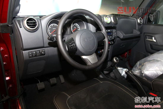 外觀方面:由于其外形酷似Jeep的牧馬人而引起了廣泛越野發燒友的關注,造型非常粗獷,前后保險杠,輪眉,側裙等部分都采用向外拱起的塑料件,野性十足,前臉的造型采用豎條格柵,看上去很有之前JEEP的味道。后車廂頂篷可以拆下來,帶來更多野外駕駛樂趣。輪胎也采用標準的越野車款式,小輪圈搭配大輪胎,搭配很高的離地間隙,可以讓人有信心趟過條件苛刻的破敗路面。