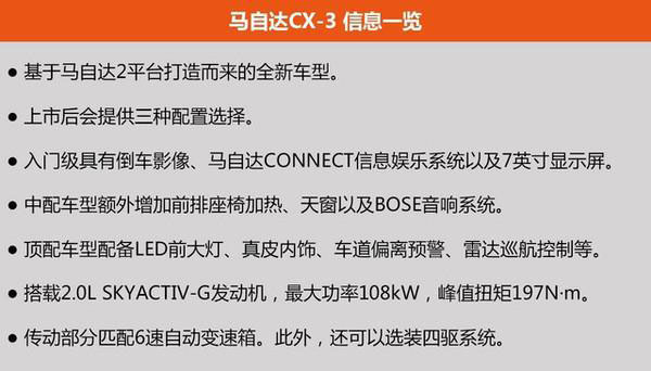 日前有消息稱,在去年的洛杉磯車展之上首發(fā)的馬自達(dá)全新小型SUV CX-3將于秋季在美國(guó)市場(chǎng)銷售。鑒于中國(guó)對(duì)SUV的巨大需求,CX-3在未來或許也會(huì)進(jìn)入中國(guó)市場(chǎng)。