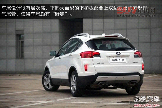作為一汽奔騰旗下首款SUV,奔騰X80的外型設計很漂亮,盾形鍍鉻進氣格柵配以加入LED日行燈的前大燈,使其前臉充滿時尚氣息。其實前臉并不是奔騰X80外形的重點,側面圓潤流暢的車身線條帶來極為運動的風格,同時車尾部分的大氣飽滿,也與前臉遙相呼應。