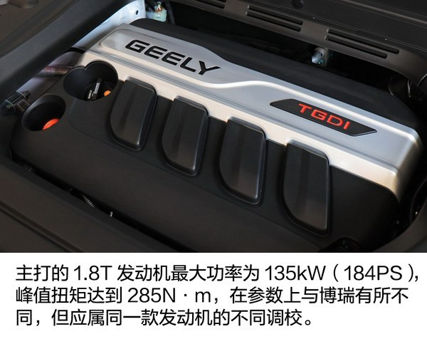 動力方面,博越搭載了1.8T渦輪增壓發動機,最大功率為:135kW(184PS),最大扭矩為:285N·m,按照吉利的說法,博越上的已經是第二代的1.8T增壓發動機,在參數上相比于博瑞有著不同程度的增長,并且在NVH等方面也進行了升級,與之匹配的是6速自動變速箱和6速手動變速箱。