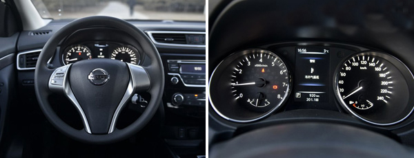 內飾方面,逍客的內飾風格采用了名為飛翼式的環抱一體化布局,整體風格與外觀相呼應,偏向年輕運動,很好的迎合了年輕人的審美。方向盤,采用了三輻式設計,方向盤多功能按鍵采用的是鍍鉻裝飾條,這樣給人感覺一種高端的運動感。儀表盤方面同樣采用的是是雙圓形類似炮筒式設計理念,不過中間的小屏幕顯示的信息非常豐富,行車電腦里還有對車道偏離提醒、盲區檢測、緊急制動以及駐車輔助等功能。