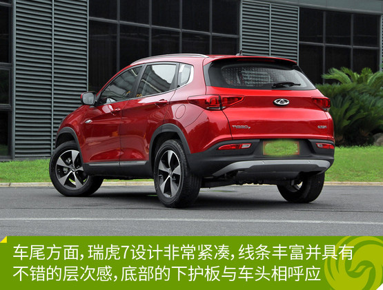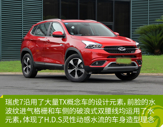 外觀方面,瑞虎7沿用了大量TX概念車的設計元素,前臉的水波紋進氣格柵和車側的破浪式雙腰線均運用了「水」元素,體現了H.D.S靈性動感水流的車身造型理念,用線條的流動表現蓄力向前的力量。此外,作為一款緊湊型SUV,瑞虎7采用了較短的前后懸設計,整體看上去更加靈活,同時在瑞虎5的基礎上加長了軸距,從而擴充了車內空間。