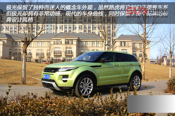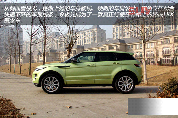 從側面看極光,逐漸上揚的車身腰線、硬朗的車肩設計、黑色立柱配合快速下降的車頂線條,令極光成為了一款真正行使在公路上的路虎LRX概念車。