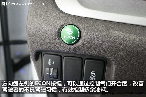 方向盤的造型延續了本田慣用的三輻式設計,更能營造一種運動的感覺。多功能按鍵部分變成了圓形,按鍵布局簡潔,使用起來簡單易懂。表面采用磨砂處理,給人的手感很不錯。方向盤左側的ECON按鍵,在新思域上我們早已見過,這個被稱為智能化綠色節能輔助系統的節能環保功能,可以通過控制氣門開合度,改善駕駛者的不良駕駛習慣,有效控制駕駛者猛踩油門造成的多余油耗,同時還可以調整制冷工況,使空調處于最佳的節能狀態,從而降低發動機能耗。