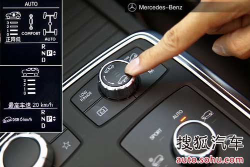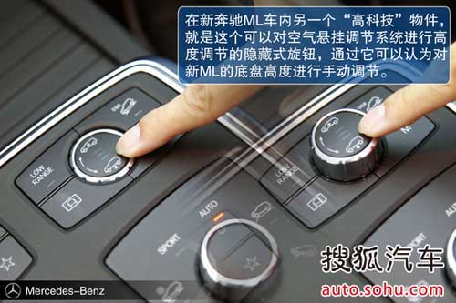 在新奔馳ML車(chē)內(nèi)另一個(gè)"高科技"物件,就是這個(gè)可以對(duì)空氣懸掛調(diào)節(jié)系統(tǒng)進(jìn)行高度調(diào)節(jié)的隱藏式旋鈕,通過(guò)它可以人為對(duì)新ML的底盤(pán)高度進(jìn)行手動(dòng)調(diào)節(jié)。另外,在這個(gè)旋鈕的周?chē)€提供有低速四驅(qū)、陡坡緩降以及手動(dòng)換擋模式等按鈕。