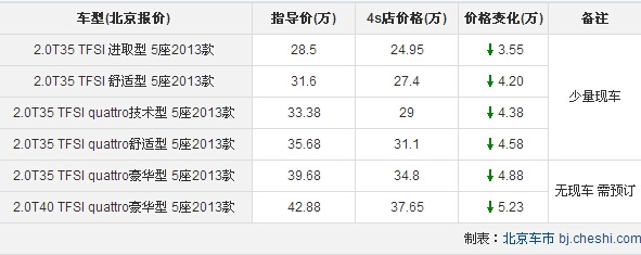 2012年4月8日,一汽-大眾奧迪國產Q3正式上市。此次上市的新車依舊搭載兩種不同功率的2.0T發動機,并根據配置的不同推出六款車型,售價區間為28.50萬元-42.88萬元。近日,筆者從奧迪北京華陽奧通4S店獲悉,奧迪Q3有少量現車,最高綜合優惠5.23萬元。具體如下: