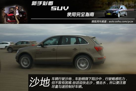 SUV由于電系與進氣排氣位置較高,而有較佳的涉水能力,一般的SUV涉水能力約與輪胎高度相彷,涉水行駛前需探查了解水深,除了河床底部凹凸不平不易掌握外,積水的道路其街頭街尾的水深差別有時極大,需注意車速不可太快,激起水花濺濕電路而熄火是常有的情況。
