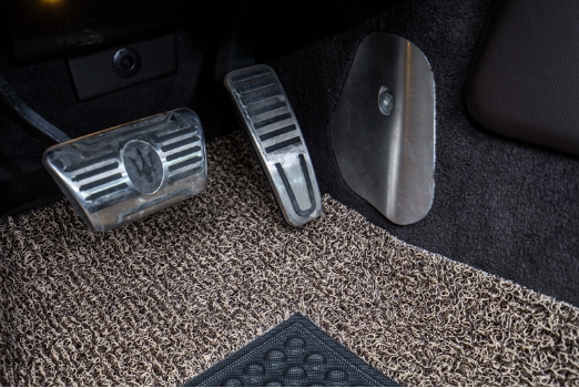 所以,要么換成薄一點的腳墊,要么把油門踏板調高一點。瑪莎拉蒂是可以選裝踏板組高低調節的,只需按一下集成在座椅上的按鈕,就能完成調節。
