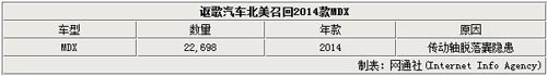 MDX作為謳歌品牌在華的主打車型,全新一代產品于今年10月舉行的廣州車展上正式上市,73.9萬元的起售價給予了消費者更多選擇空間。近日網通社從美國高速公路安全管理局(NHTSA)獲悉:謳歌官方宣布將在美國及加拿大對旗下2014款MDX實施召回,原因則是傳動軸存在脫落隱患。據統計將有22,698輛車受到影響。此外記者從謳歌中國得到官方回復:國內所售2014款MDX將不涉及此次召回。
