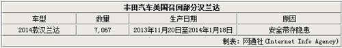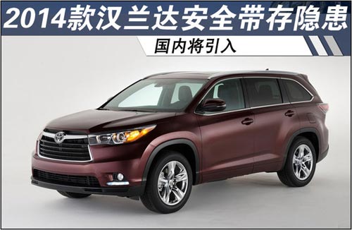 豐田汽車于去年紐約車展亮相了全新一代漢蘭達(dá)車型,而該款車型也將于今年年底引入中國市場由廣汽豐田上市銷售。近日記者從豐田官方獲悉,因安全帶存在隱患,豐田官方正在美國市場對部分2014款漢蘭達(dá)實施召回。據(jù)統(tǒng)計將有7,067輛車受到影響。