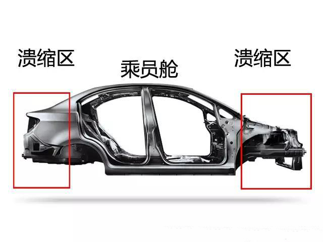 談這兩個問題我們先得講講汽車的車身結(jié)構(gòu)。目前汽車主要采用非承載式車身,根據(jù)安全功能可以分為車頭車尾的潰縮吸能區(qū)域、乘員艙三個部分。值得一再強調(diào)的是,車子作為一個整體,并非各個區(qū)域越硬越好,而是“軟硬結(jié)合、安全更佳”。