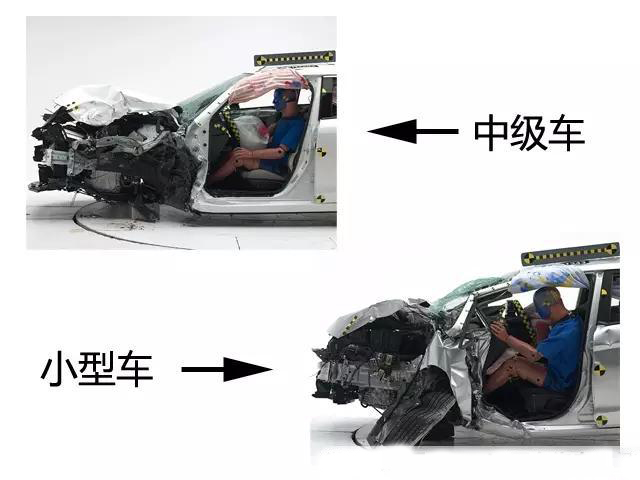 而車輛的大小主要影響其潰縮吸能區(qū)域的面積,拿小型車和中型車作比,可以明顯發(fā)現(xiàn)小型車前部更短小,同樣的沖擊下,乘員艙受到的威脅更明顯,車內(nèi)乘員受到傷害的可能性就越高啦。