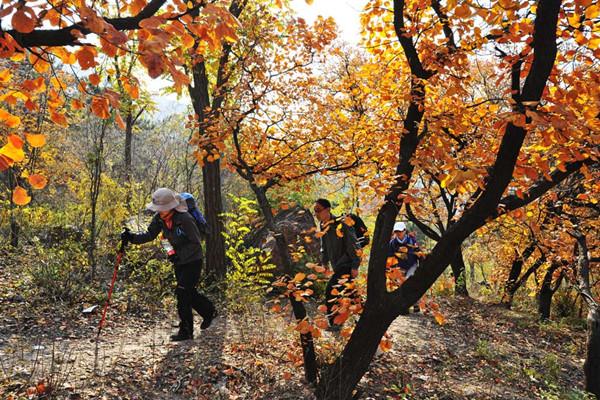 秋色盈金,成片、成叢的元寶楓、紅櫨、黃櫨、槲樹,樹葉流丹,如霞似錦,織成一幅五彩斑斕的水墨畫。行走其間,人在畫中游。