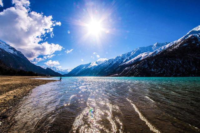 然烏湖的湖邊是一大片碧草如茵的草甸,和著碧藍的湖水、白雪皚皚的雪峰,景色如詩如畫。狹長的阿木錯湖向西蜿蜒十余千米逐漸收縮成一道河谷,隨季節(jié)的不同,河水也呈現(xiàn)出或碧藍或青綠等數(shù)種顏色。河道中許多巖石和小島點綴其間,湖面上春季樹影婆娑秋冬薄霧彌漫,四季美景都會使人如進夢幻之境。