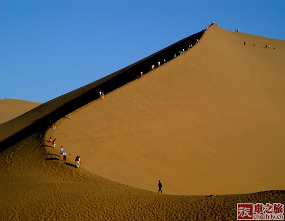 鳴沙山距離市區(qū)5KM,公交很方便。旅游城市真的很方便,這哪兒需要拼車呢?太方便了,非常適合我們這種出門在外就怕被燒的人。一條直路,遠遠就能看見高高的沙山,比我想象中的要高一些,基本和影視作品里面描繪的差不多,一到地方,我就沖向了這傳說中的沙漠。向陽的一面沙還真的有點燙腳,不過想想可能可以治療宮寒,我就毫不猶豫的踩進去了,哎呀呀,燒!這里的沙子有多深呢?真的沒有泥土和巖石么?我們的墊層在哪里?……順著山脊往上走,踩著細細的沙,覺得爬這樣的山和爬青城山那樣的山比起來要輕松許多,不用在意腳下是否有路是否需要上下梯步。廣闊的沙漠和萬里無云的藍天,這畫面就已經(jīng)讓我夠滿足的了。去年在青海湖邊看到沙漠的那天天氣不好,也不曾有這樣親密的接觸,所以沒有感覺到她的溫柔。本來去之前就老跟瓶子說一定要騎駱駝,至少得騎上駱駝拍張照,但到地方的時候就沒忍住激動,光腳丫子上山了。我想以古代人走絲綢之路的狀態(tài)來走一走,看看是什么感覺。