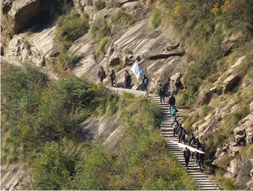 宣傳活動(dòng)的每周五晚,大巴車載著“勇闖一族”大學(xué)生們向清涼峰駐地——永來(lái)村進(jìn)發(fā),到達(dá)永來(lái)村已是凌晨00:30多,由于清涼峰道路原始而沒(méi)有臺(tái)階,并且要翻過(guò)數(shù)個(gè)山頭,加之行程較長(zhǎng),要達(dá)到1787.4米峰頂并在太陽(yáng)下山前返回駐地,必須要在凌晨05:00前動(dòng)身攀爬,那就意味著同學(xué)們只有不足4個(gè)小時(shí)的睡眠。盡管如此安排,90后的“勇闖一族大學(xué)生們”沒(méi)有一句怨言,并有紀(jì)律、有計(jì)劃地執(zhí)行被安排的各項(xiàng)工作(早餐、準(zhǔn)備裝備等),在攀爬途中,在崎嶇的山路上手腳并用,表現(xiàn)出了不僅僅是旺盛的生命力,更表現(xiàn)出了不屈不撓的意志力,在大家的共同努力下,兩所大學(xué)所有隊(duì)員均成功登頂,完美詮釋了“勇闖一族”的勇闖天涯精神。