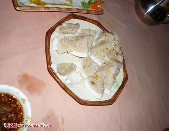 竹筒飯:竹筒飯有鹽巴飯、豆飯、肉飯等多種。其制作方法為:以山蘭稻中的香米為原料,砍下家種的粉竹或山里長的山竹,鋸成一節(jié)一節(jié)的竹筒,然后裝進適量的香米和水,再用香蕉葉將竹筒口堵嚴(yán),放到炭火里烤,烤至青竹變焦,飯便熟了。現(xiàn)在,竹筒飯進入酒店后,多用電烤爐將之烤熟,吃用時將竹筒鋸成若干小段,擺放盤中上席。