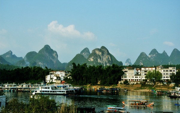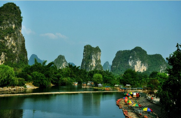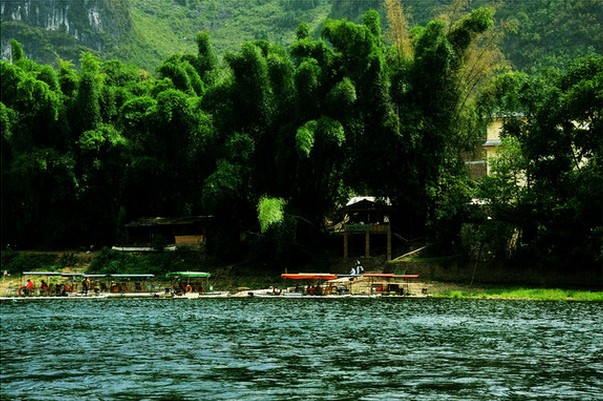 說到漓江最美的一段,也許公認(rèn)是楊堤到興坪了。楊堤是個小鎮(zhèn)子,在山水間,靜靜的存在著,成為了這十里畫廊的起點。中午時分,懶懶的陽光下,江水都像睡著了一樣沒有聲響,只是岸邊偶爾有小的浪花泛起。