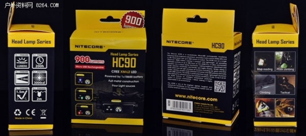 nitecore標志性的黑黃相間的色彩搭配已為國內電筒玩家熟悉和認可,外包裝上HC90的主要參數、適用環境一目了然。