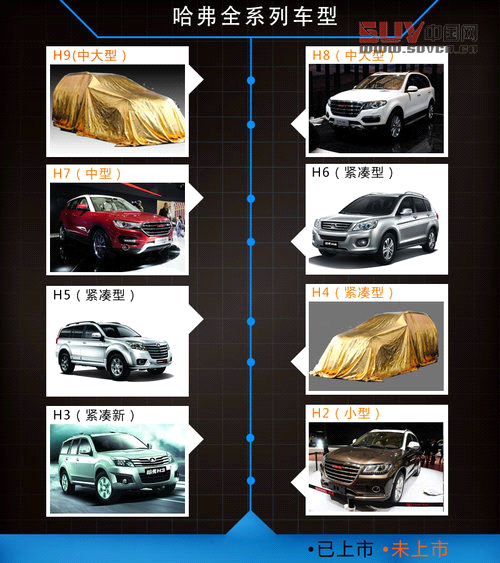 根據長城未來新產品規劃,將在2017年前推出20余款新車,其中包括多款SUV車型。哈弗在售有H3、H5和H6三款車型,因此哈弗將向上下延伸,推出H2至H9等多款車型,此外H系列中單數偏向硬派風格雙數偏向城市風格,H9作為旗艦車型在定位上高于此前亮相的H8和H7。