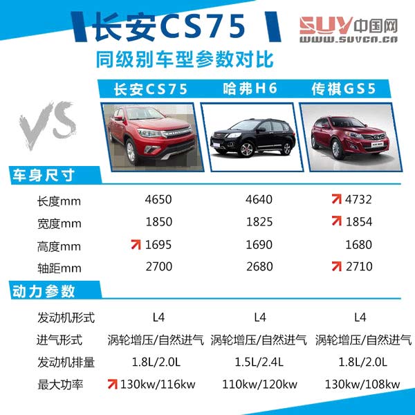 在國內緊湊級SUV市場中,哈弗H6每月銷量均為1.5萬輛左右,而傳祺GS5月銷量也達到了4800輛,長安CS75推出后,將與上述兩款車型展開較量。新車在尺寸上與競爭對手不相伯仲,動力方面其1.8T引擎與傳祺1.8T參數保持一致,2.0L排量已經超越傳祺GS5。