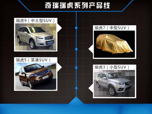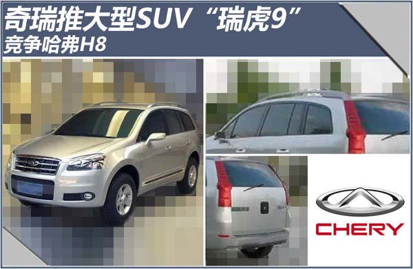 2013年10月30日,奇瑞旗下第二款SUV瑞虎5正式下線,該車定位于緊湊SUV,未來奇瑞還將推出涉足更高領域的SUV車型來提升其品牌影響力。網通社近日獲得了一組疑似奇瑞大型SUV的諜照,此外,奇瑞汽車內部人士向網通社透露:“在瑞虎品牌下,未來還會有瑞虎7、瑞虎9產品”。在動力系統方面,瑞虎9未來有望搭載奇瑞自主研發的2.0T渦輪增壓發動機,新車推出后將與哈弗H8展開競爭。