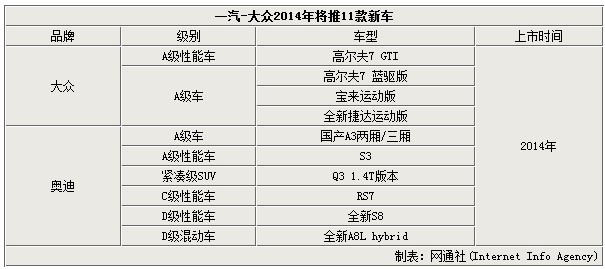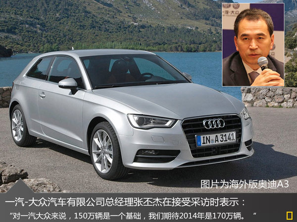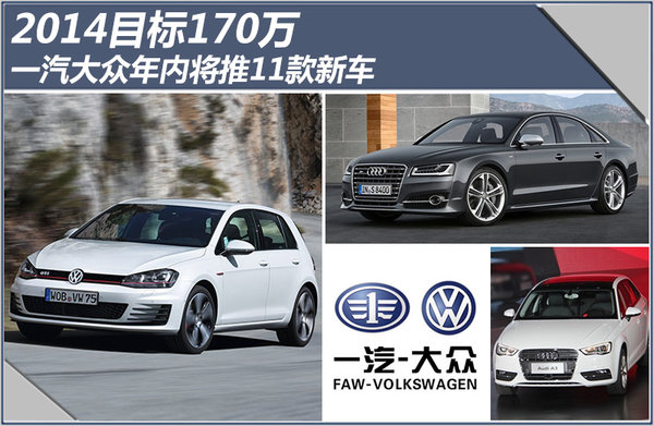 在2013年,一汽-大眾國產車型銷量達到1,526,288輛,同比增長18.4%。在進入新的一年后,一汽-大眾于近日公布了今年的銷量目標。一汽大眾汽車有限公司總經理張丕杰先生近日在接受采訪時表示:“對一汽大眾來說,150萬輛是一個基礎,也是我的一個新起點,我們期待2014年是170萬輛。”在設定新目標的同時,一汽-大眾今年將在華投放多款新車。網通社在整理相關資料后獲悉:一汽-大眾旗下的大眾與奧迪品牌,兩者預計今年將投放11款新車,其中包括高爾夫7 GTI以及國產奧迪A3等。