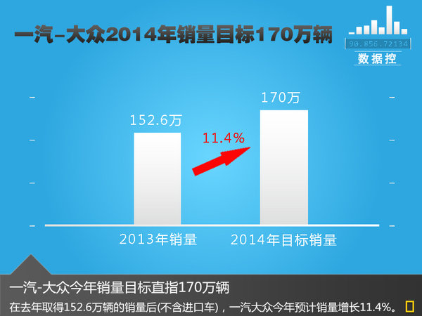 對于剛剛過去的2013年而言,一汽大眾國產車型銷量達到1,526,288輛,同比增長18.4%。而在今年,一汽-大眾將進一步提升銷量。一汽-大眾總經理張丕杰表示:“我期待一汽-大眾2014年能達到170萬輛,2015年也可以期待190萬輛,這需要我們一步一 步的去完成。”對于2014年制定的170萬輛的銷量目標,其相比2013年整體銷量增長11.4%,這樣的增長對于一汽大眾又將是一個新的挑戰。