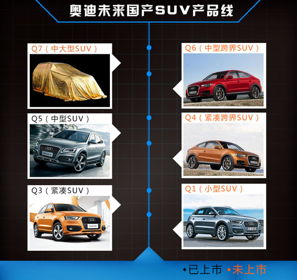 目前奧迪在華國產的SUV僅有兩款,分別為Q3和Q5,分別占據了緊湊以及中型市場。寶馬即將在華發布第二款跨界SUV-X4,而奧迪目前在跨界SUV市場中還未推出相應產品,未來隨著Q4、Q6跨界SUV的相繼國產,奧迪將在各領域與寶馬展開較量。Q1以及Q7兩款SUV國產后,也可以拉低奧迪在華SUV車型的門檻,也可使消費者更方便入手旗艦SUV-Q7。