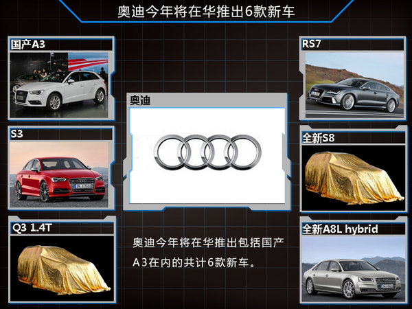 在2014年1月23日,奧迪改款A6L正式在華上市,這也預示著奧迪將在今年繼續發力,保證其領跑德系三強的位置。一汽-大眾奧迪銷售事業部執行副總經理葛樹文先生表示:一汽-大眾奧迪將在2014年推出包括國產A3在內的6款新車。其中國產A3以及Q3 1.4T車型或將成為奧迪今年在華的兩大賣點。