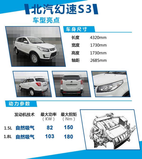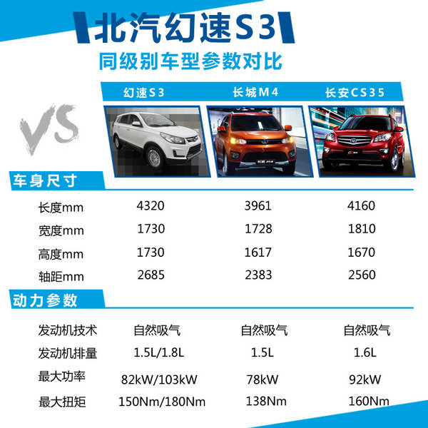 動力方面,S3將搭載1.5L、1.8L兩款自然吸氣發動機。其中1.5L發動機最大功率82kW,峰值扭矩為150Nm;1.8L發動機最大功率103kW,峰值扭矩為180Nm,與之匹配的是一臺5速手動變速箱。去年,長安CS35以7.5萬的銷量排登上小型SUV銷量冠軍寶座,S3上市后將與其展開交鋒。從車身尺寸和動力上看,幻速S3均有優勢,上市后有望打破現有小型SUV的市場格局,成為北汽又一款熱銷車型。