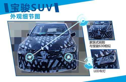 寶駿SUV采用寶駿630平臺打造,是一款緊湊型SUV.從曝光的諜照看,外觀相比此前曝光的效果圖,有略微改動。由于重度偽裝,看不到該車前臉具體細節,但可以看到車大燈采用時下流行的LED元素。車身線條簡單沒有過多的棱角和設計,整體較為圓潤。