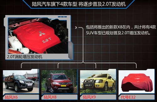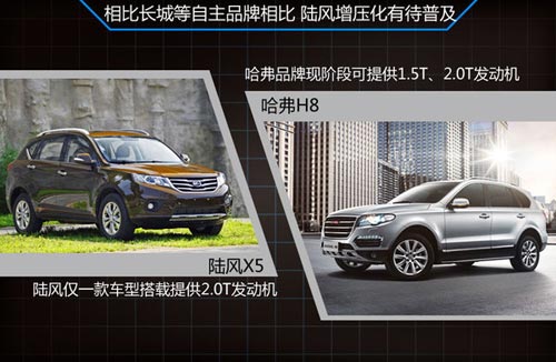 小排量增壓引擎憑借動力強,低油耗等優勢,成為國內眾多合資和自主品牌的首選。與長城、比亞迪等自主品牌相比,陸風汽車增壓發動機的普及程度顯然不如競爭對手。現階段2.0T發動機僅在陸風X5一款車型上搭載,在產品競爭力和選擇空間依然有待提升。如X6、X9等SUV,目前仍搭載的是自然吸氣發動機。