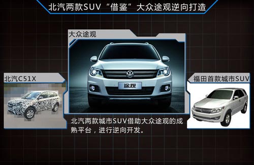 自主品牌一路發展以來,產品的逆向研發是一個揮之不去話題,尤其是在發展起步階段,借鑒、模仿同類型產品幾乎成了所有自主品牌的“必經之路”。作為國內大型汽車集團之一的北汽也不能免俗。繼去年推出首款SUV—BJ40以后,今年北汽將加快SUV的布局推出時下熱門的城市SUV,值得一提的是其中北汽C51X以及北汽福田的首款SUV均借鑒大眾熱賣城市SUV途觀打造。從之前曝光的諜照看,這兩款車外觀與大眾途觀極為相似。