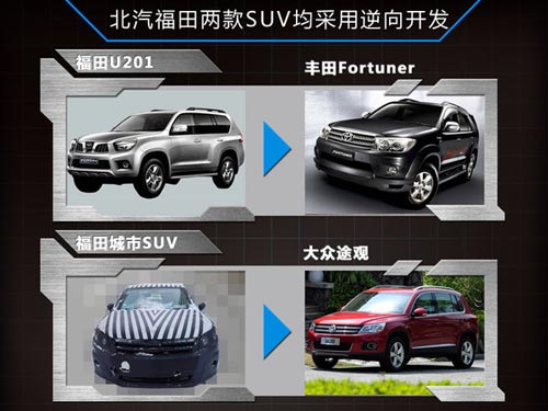 除了C51X外,北汽福田的第二款SUV也將借鑒大眾途觀車型進行逆向開發。作為國內商用車的老大,福田轉戰乘用車市場后推出的首款SUV—U201是一款硬派SUV,當時也是以豐田的Fortuner越野車底盤為原型開發。如今,在SUV市場城市SUV一支獨大,北汽福田的第二款SUV也將選擇該細分市場的熱銷產品途觀作為借鑒對象。不過,該車量產后并不會保留酷似途觀的造型。