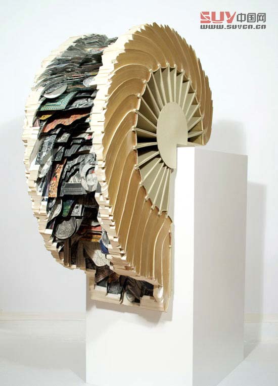 仔細看Brian Dettmer作品,形式上是變化多樣。每一本書平面視覺構成感強烈,適當的留白、有對比的分割、層次遞進與色澤交相輝映都很優美,主次突出,整體的一本書籍就是一個故事,優雅而利落。Brian Dettmer的最新系列的作品中則更傾向于立體造型與動態的美感,仿若一尊尊大型雕塑,工藝制作更為精進繁復,視覺上沖擊力量強大。
