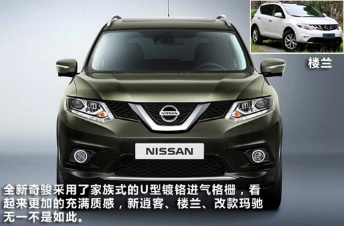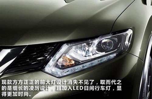 前臉方面,全新奇駿采用了家族式的U型鍍鉻進氣格柵,看起來更加的充滿質感,新逍客、樓蘭、改款瑪馳無一不是如此。前大燈的的造型也發生了翻天覆地的變化,現款方方正正的設計消失不見了,取而代之的是細長的凌厲設計,且加入LED日間行車燈,顯得更加時尚。