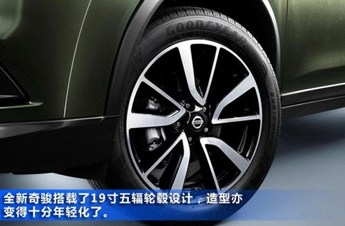 車身側面,新一代奇駿也明顯比現款更加圓潤了,上揚的設計線條更顯年輕氣息。但是,豎直的D柱設計則依舊被保留了下來,這明顯將帶來較好的后排乘坐空間。另外,四輪輪拱也十分顯眼,更顯得壯實。輪轂方面,全新奇駿搭載了19寸五輻輪轂設計,造型亦變得十分年輕化了。