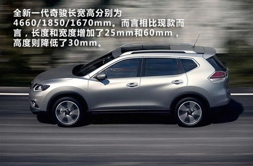 尺寸方面,全新一代奇駿長寬高分別為4660/1850/1670mm。相比現款而言,長度和寬度增加了25mm和60mm,高度則降低了30mm。