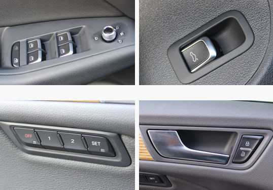 駕駛席位置左側車門配備眾多便捷功能按鍵,如全車車窗升降控制、外后視鏡加熱/折疊及調節功能、車門/后備箱鎖及駕駛席座椅記憶設定功能,而且分布之外均相當合理,恰如一種觸手可及的感覺。